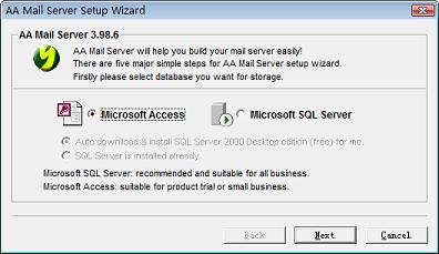 When you choose SQL Server database, there will be two choices: you install SQL Server yourself or AA Mail Server will downloald and install SQL Server 2000 Desktop Engine (short fo "MSDE2000"). See also: which database is suitable for my business?